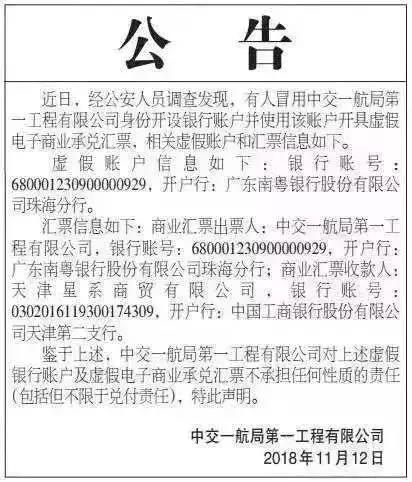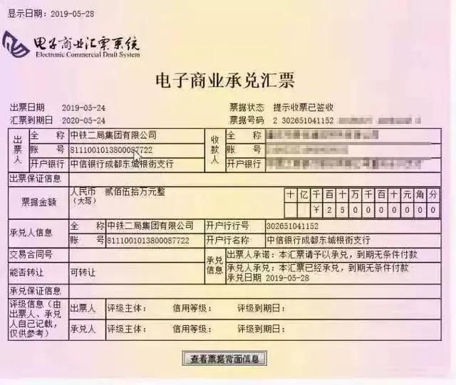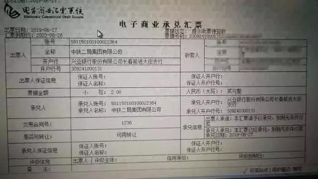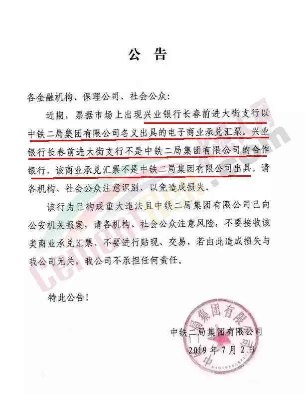 并且中铁二局公司已经向公安机关报案,请各机构、社会公众注意风险,不要接收该类商业承兑汇票、不要进行贴现、交易,造成的损失中铁二局不承担责任。 说白了这票和中铁二局没有关系,到期可能无法兑付。