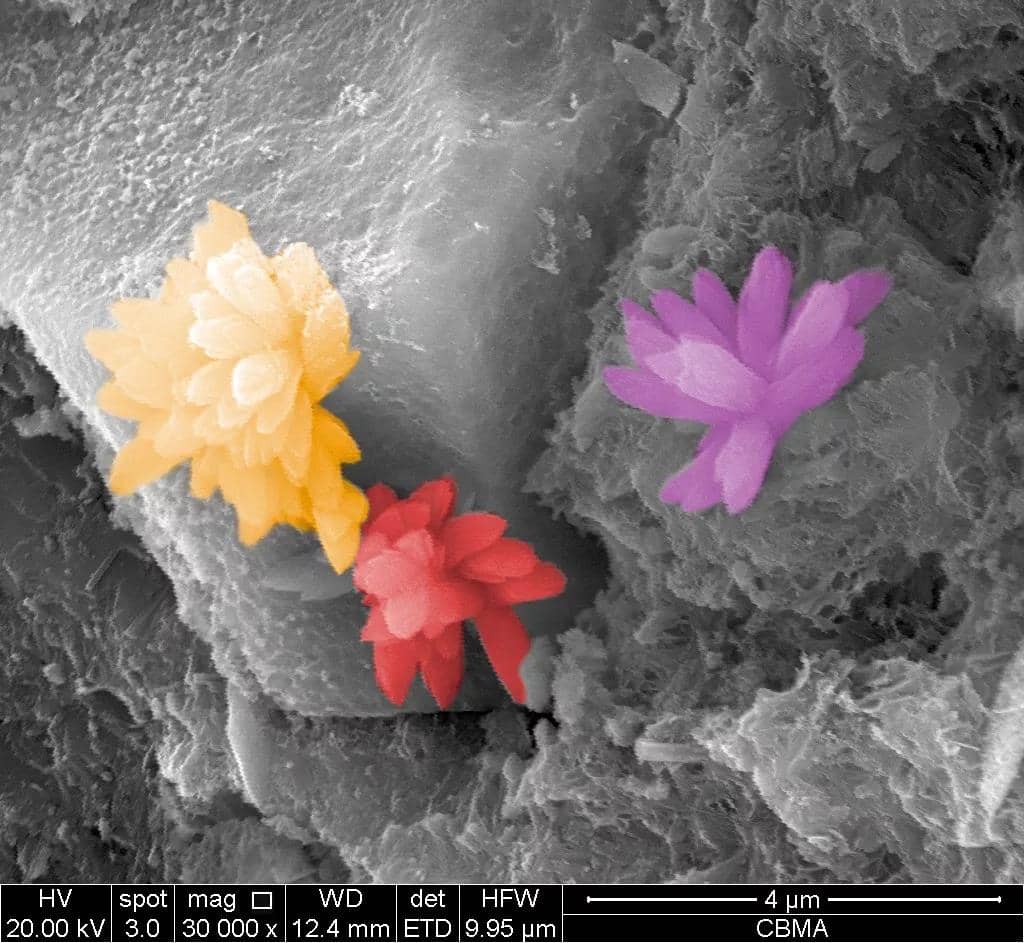 水泥水化产物的微观形貌,犹如盛开的鲜花。硅酸盐水泥拌合水后,四种主要熟料矿物会与水发生反应。