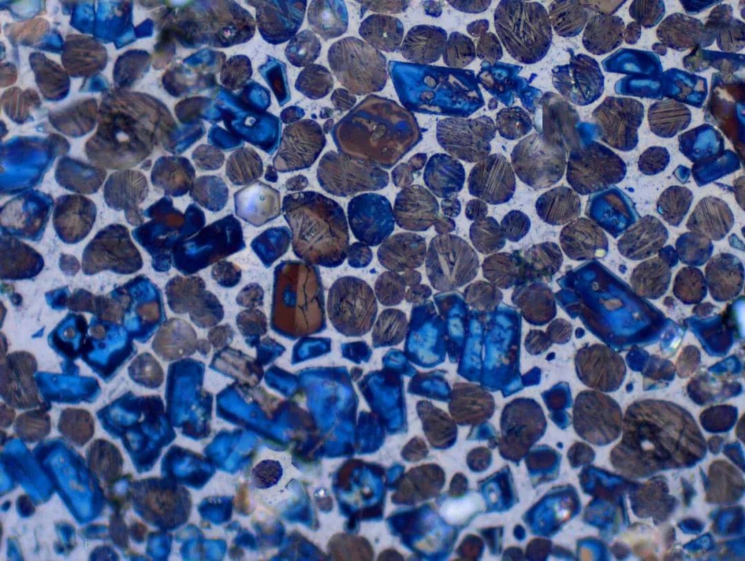 低热硅酸盐水泥熟料的金相显微镜照片,可以看到硅酸二钙矿物呈椭圆形,有明显交叉双晶纹,犹如晶莹透亮的宝石。
