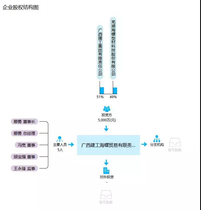据水泥人网了解,广西建工海螺贸易有限公司于今年(2019年)1月3日由广西建工集团有限责任公司和芜湖海螺型材科技股份有限公司共同出资注册成立。其中广西建工集团有限责任公司持股51%,芜湖海螺型材科技股份有限公司持股49%。