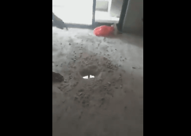 从视频中可见,该事件发生在梅州富力城第4期22栋803号房,业主仅用一把螺丝刀便可以轻松刮开地板上的水泥,捅出一个窟窿,水泥毫无强度、韧性、稳定性可言,钢筋也是相当细,根本无法想象这可以保证楼上、楼下两家人的日常生活安全。