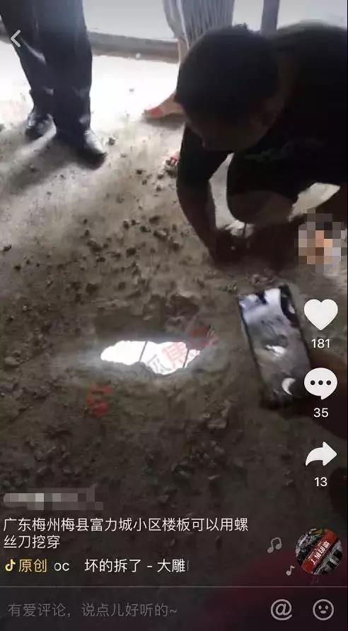 该业主还提供了一张问题房屋业主L先生(化名)的抖音截图,小助理在L先生抖音首页上发现了两段关于梅州富力城的视频,其中一段视频,浏览量已达4.4W,并配文表示梅州富力城小区楼板可以用螺丝刀挖穿,这样的工程质量不知道相关部门是怎么验收合格的。