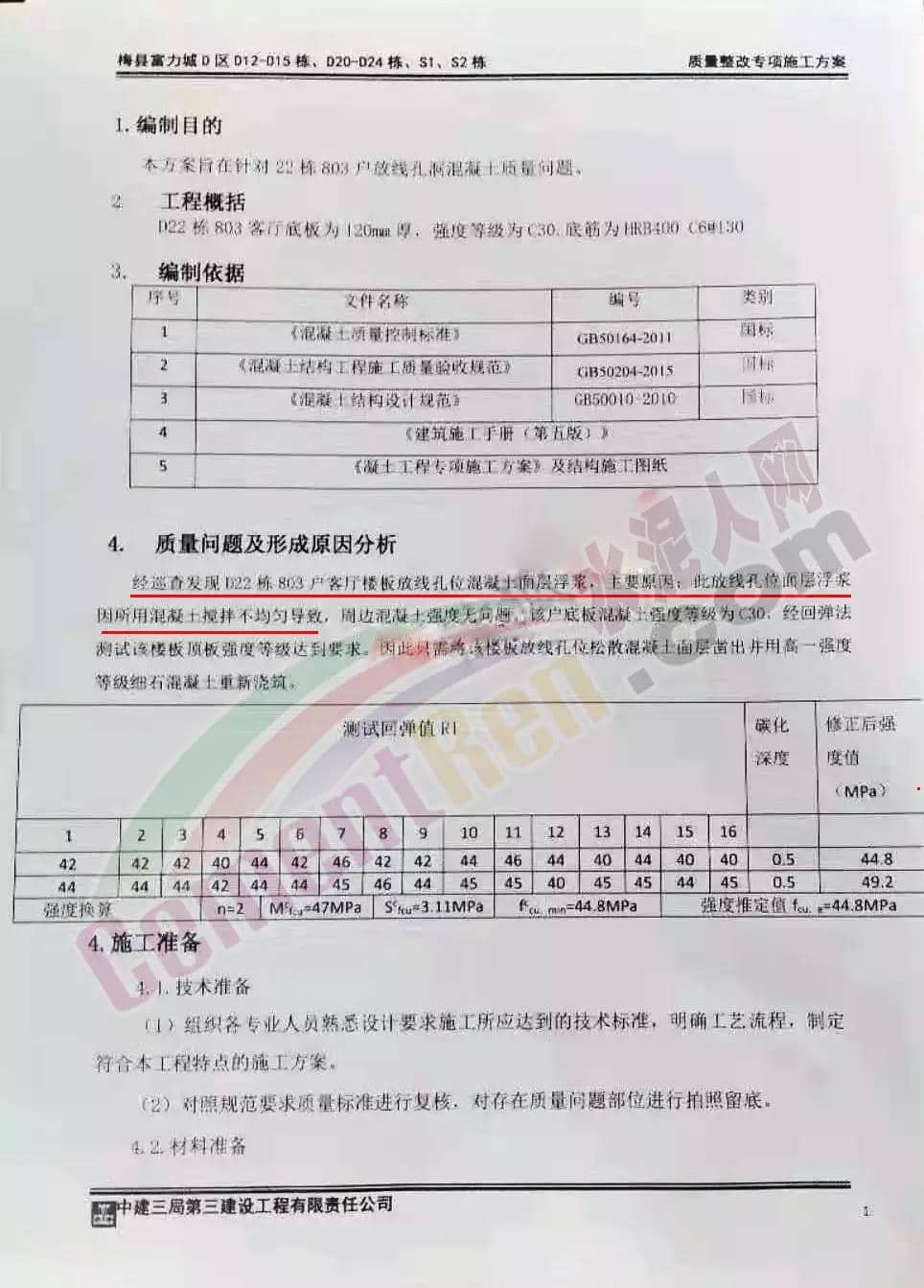 该质量整改项施工方案中指出:经巡查发现D22栋803户客厅楼板放线孔位混凝土面层浮桨因所用混凝土搅拌不均匀导致,周边混凝土强度无问题,一句轻描淡写的话就给此事划上了句号。