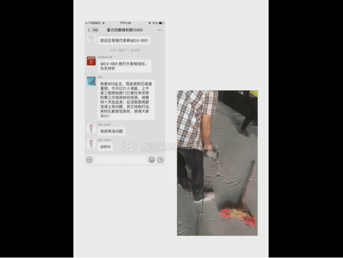 据梅州富力城4期初业主表示:昨晚该视频在微信群传开了,出于对自身房屋的担忧,还特意去检测了下自己的房子,幸好没发现问题。“可能是不同时期建造的房子,混凝土质量不一样。” 该业主表示。
