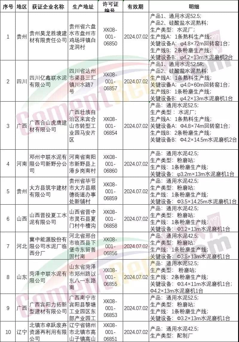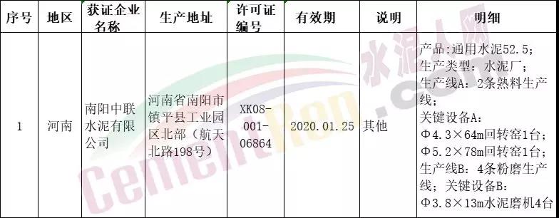 本期发放生产许可证的南阳中联水泥有限公司生产地址位于河南省南阳市镇平县工业园区北部(航天北路198号)发证说明为“其他”。据水泥人网了解,南阳中联水泥有限公司2018年12月29日举行了揭牌仪式,中国联合水泥集团有限公司南阳分公司正式变更为具有独立法人资格的南阳中联水泥有限公司。国家市场监管总局七月第一批生产许可证发放详情如下: