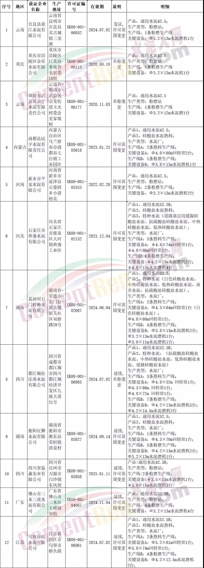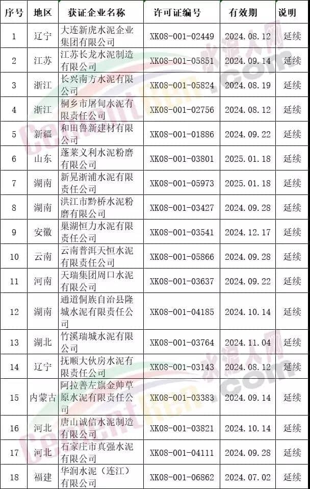 七月第一批发放证书涉及许可范围、项目名称变更的共12个编号,其中包括石家庄市曲寨水泥有限公司、葛洲坝石门特种水泥有限公司、都江堰拉法基水泥有限公司等多家生产特种水泥及通用52.5水泥产品的全能水泥厂;涉及生产许可证到期延续的企业共计18个编号。