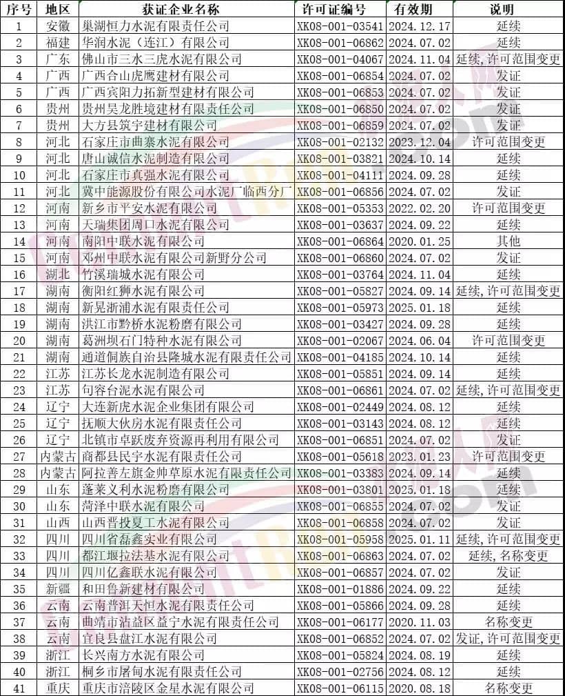 日前,国家市场监管总局发放本月第一批41个编号水泥企业生产许可证。其中新发证书包括贵州昊龙胜境建材有限责任公司、四川亿鑫联水泥有限公司、广西合山虎鹰建材有限公司等三家全能水泥生产企业以及邓州中联水泥有限公司新野分公司、大方县筑宇建材有限公司、山西晋投夏工水泥有限公司、冀中能源股份有限公司水泥厂临西分厂、菏泽中联水泥有限公司、广西宾阳力拓新型建材有限公司等6家水泥粉磨企业;