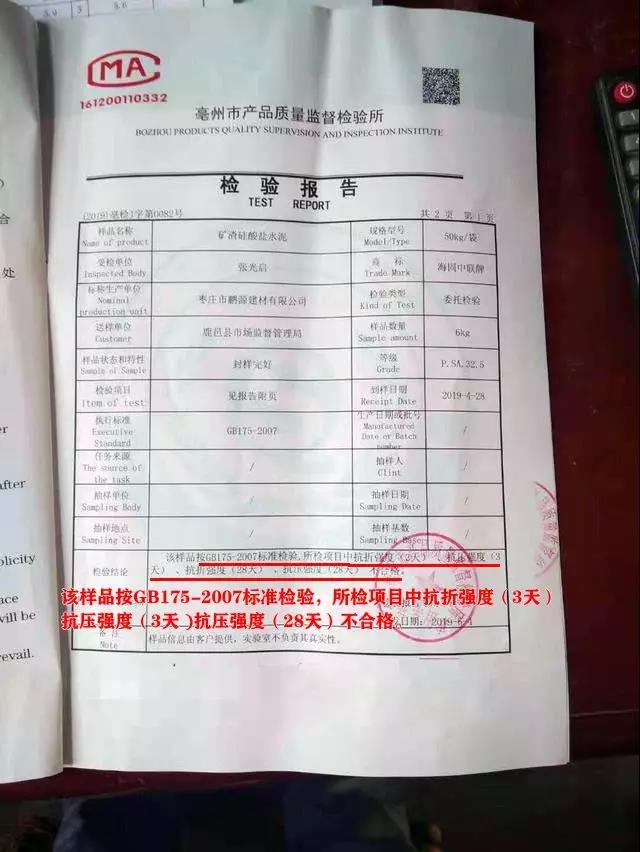 记者在亳州市产品质量监督检验所6月出具的检验报告上看到,该水泥样品显示: