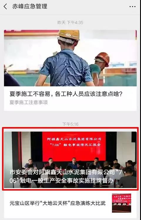 消息称:水泥人网消息:7月6日,内蒙古赤峰市阿鲁科尔沁旗鑫天山水泥集团有限公司发生1起触电一般生产安全事故,死亡1人。事故发生后,赤峰市领导高度重视,自治区政府副主席、市委书记段志强作出重要批示,要求市应急管理局“举一反三,抓好全市夏季安全生产”。