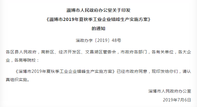 (五)水泥(不含粉磨站)。以山东省水泥行业协会《关于支持组织山东省水泥企业熟料生产线实施夏季错峰生产的函》(鲁水协字〔2019〕05号)文件中规定的停产时间为准,协同处理固废或危废的企业应当按照停产时间要求,核算限产比例和实际产量。停产时间为8月17日—9月5日,时间20天。前期6月1日-20日,未落实错峰要求的,需在本方案规定的夏秋季错峰期间一并补齐。