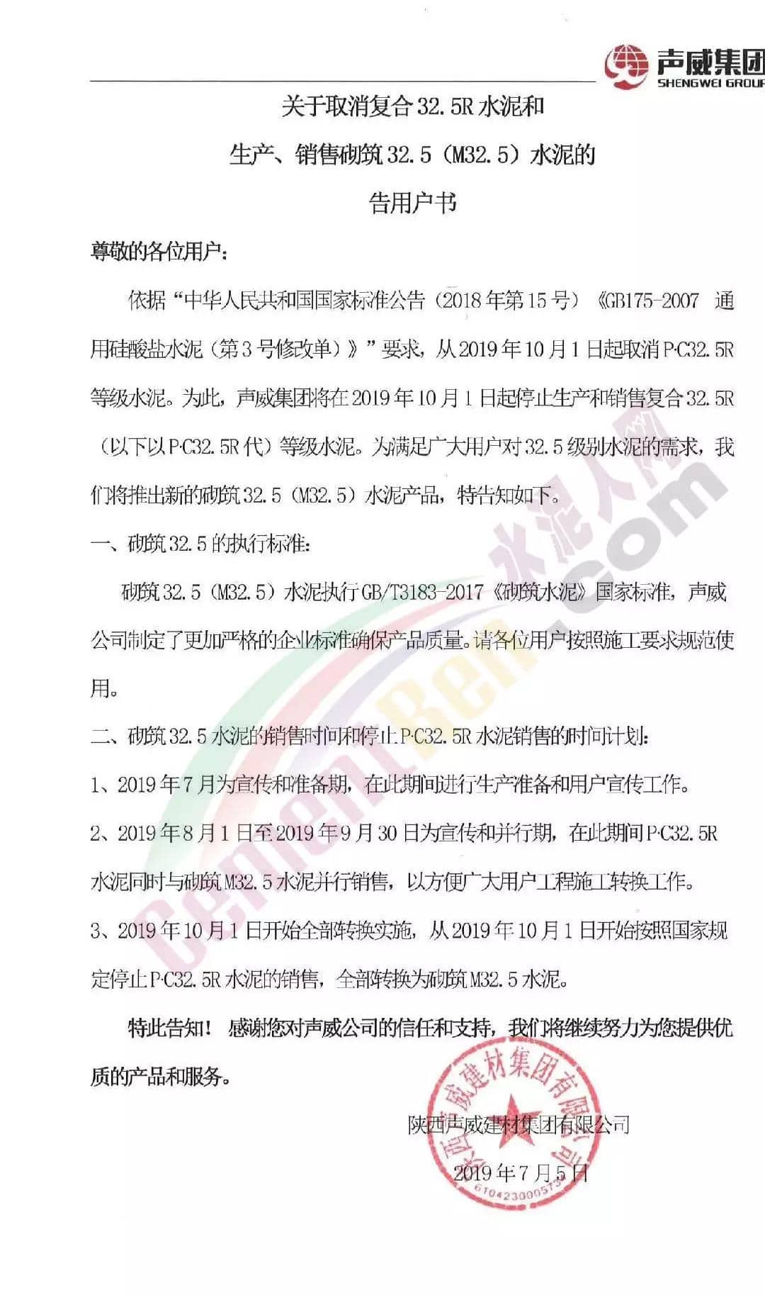 陕西声威集团的告用户书称:根据“中华人民共和国国家标准公告(2018年第15号)《GB175-2007通用硅酸盐水泥(第3号修改单)》”要求,从2019年10月1日起取消PC32.5R等级水泥。为此声威集团将在2019年10月1日起停止生产和销售复合32.5R(以下以PC32.5R代)等级水泥。为满足广大用户对32.5级别水泥的需求,声威集团将推出新的砌筑32.5(M32.5)水泥产品。