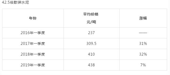 国家统计局数据显示,自2016年一季度以来,水泥价格逐年上涨。从2016年季度的237元/吨,到2019年一季度匀价438元/吨,三年多时间涨幅达85%,而整个水泥行业的利润从2015年的14.29元/吨提高到2018年的71.29元/吨。