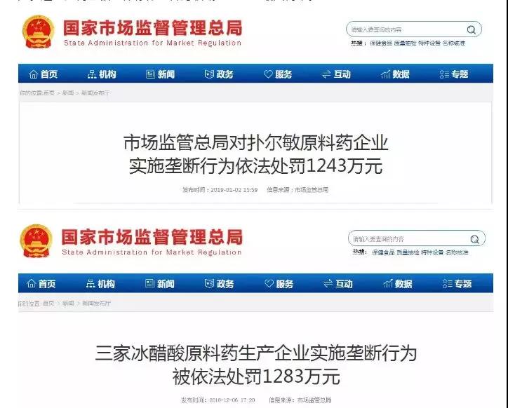 今年年初市场监管总局开出了今年的首张罚单:1月9日,扑尔敏原料药企业湖南尔康医药和河南九势制药就因违反反垄断法规定,两家企业共被判罚1243.14万元。去年12月6日,三家冰醋酸原料药生产企业也因垄断行为被处罚:没收违法所得及罚款共计1283.38万元。这一处罚也被媒体称作原料药领域反垄断的最大罚单。