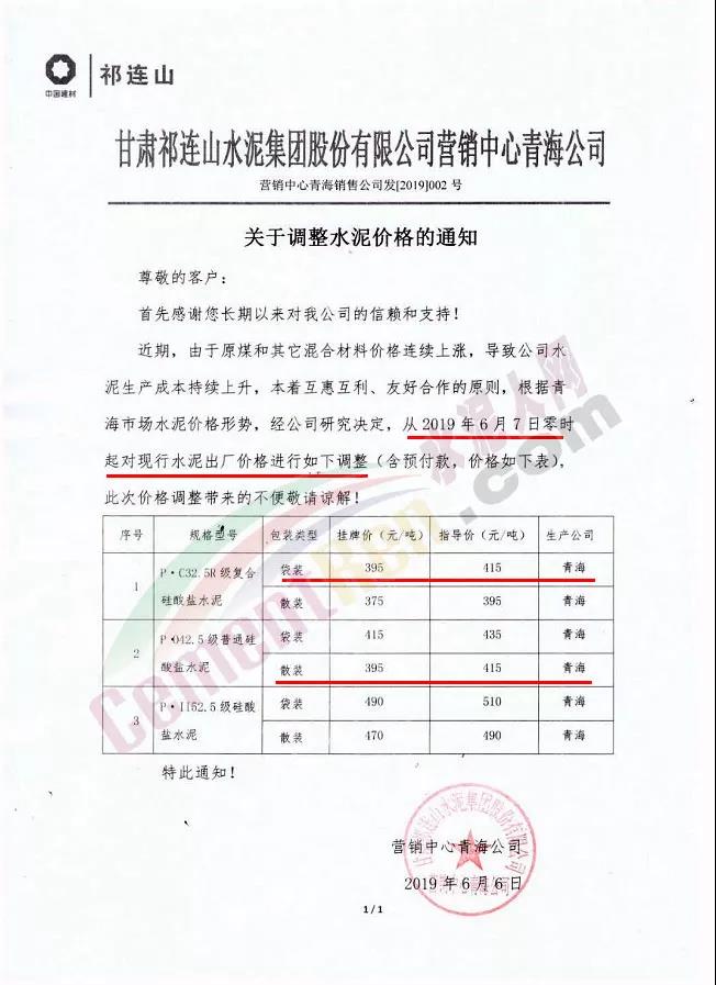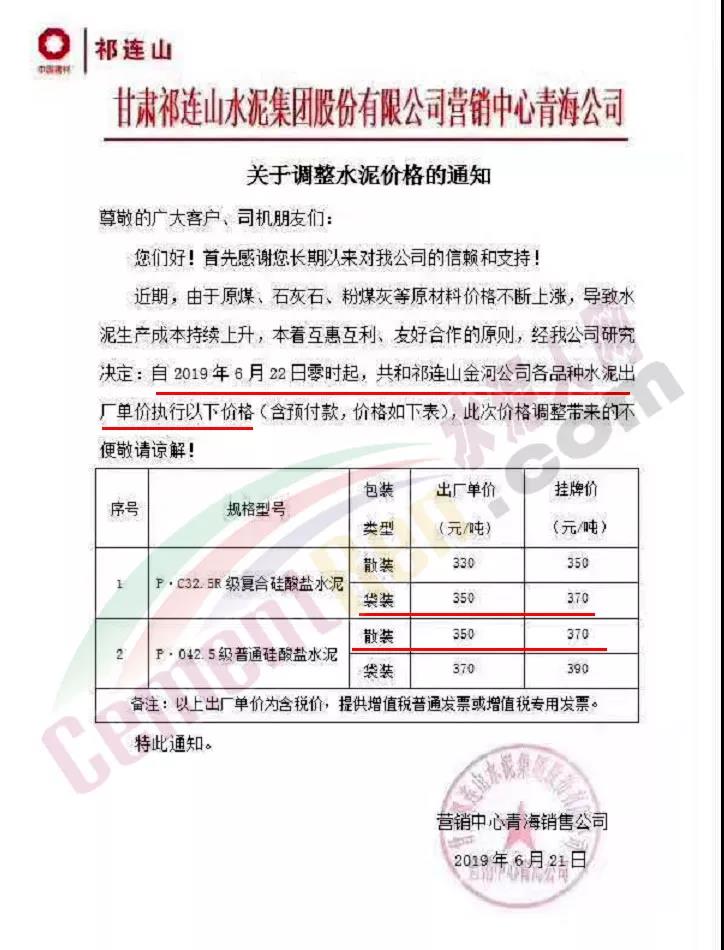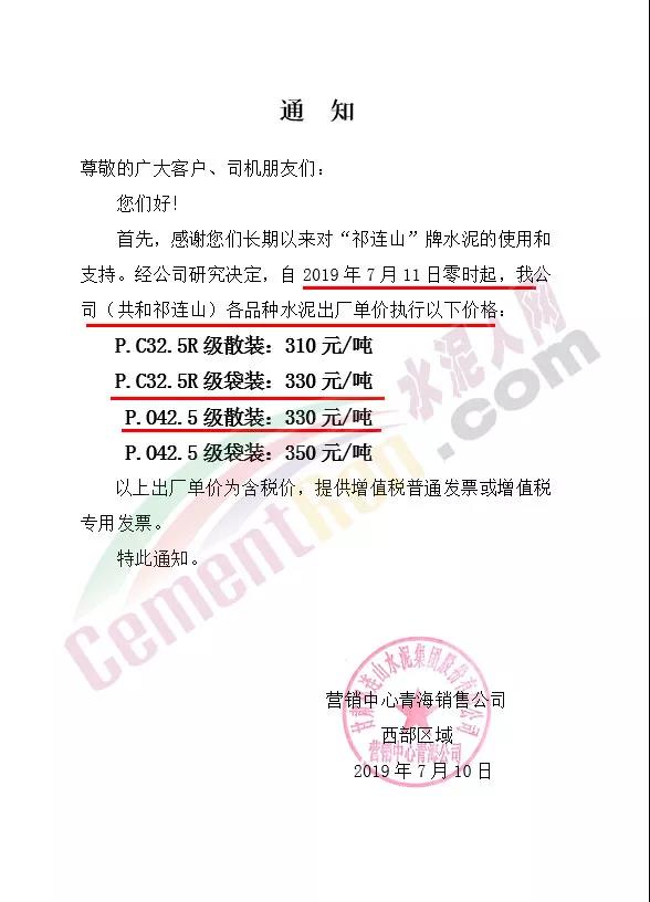 祁连山水泥营销中心青海销售公司发通知称,自7月11日零时起共和祁连山水泥各品种水泥执行新的出厂价格,其中PO.42.5散装水泥报价330元/吨。P.C32.5R级袋装水泥也执行330元/吨。