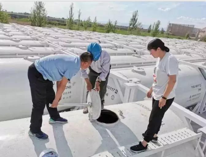 图:中国铁路呼和浩特局集团有限公司呼和浩特货运中心沙良物流园内, 装载着散装水泥的40个罐式集装箱,整装待发将被发运至丰台西站为建设雄安新区“添砖加瓦”。