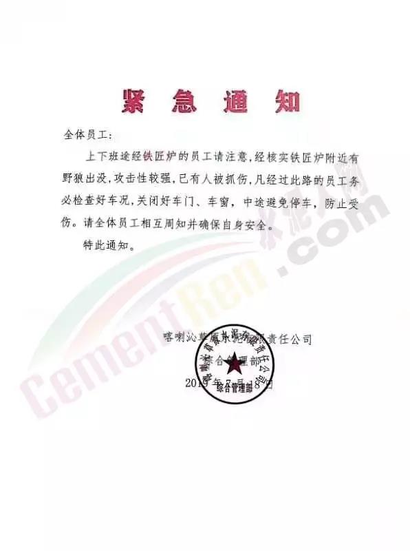 昨日(18日)喀喇沁草原水泥有限责任公司发布紧急通知给全体员工称,上下班途经铁匠炉的员工需注意,经核实铁匠炉附近有野狼出没,攻击性较强,已有人被抓伤,凡经过此路的员工务必检查好车况,关闭好车门、车窗,中途避免停车,防止受伤。请全体员工相互周知并确保自身安全。