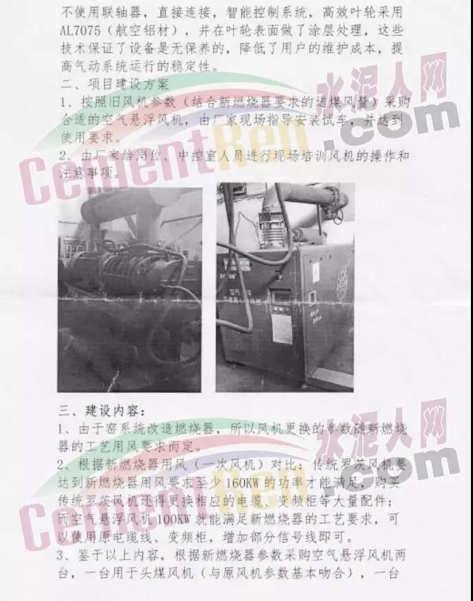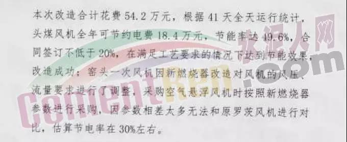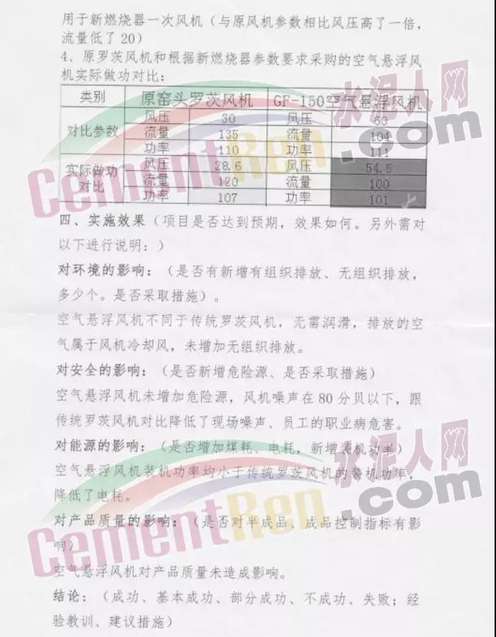2、窑头空气悬浮风机:因燃烧器改造后风压要求高于原燃烧器一倍,订购空气悬浮风机时按照新燃烧器设计参数采购,对比实际参数做功时按照空气悬浮风机风压、流量接近于原罗茨风机进行,上图中标黄数据为接近原罗茨风机的参数和用电量;根据对比节电率为30.5%,达到合同签订要求。