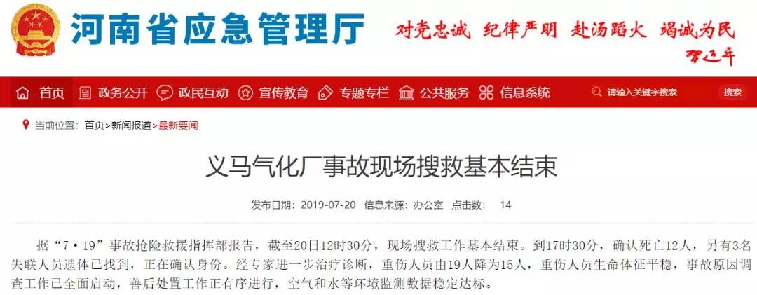 到17时30分,确认死亡12人,另有3名失联人员遗体已找到,正在确认身份。经专家进一步治疗诊断,重伤人员由19人降为15人,重伤人员生命体征平稳,事故原因调查工作已全面启动,善后处置工作正有序进行,空气和水等环境监测数据稳定达标。