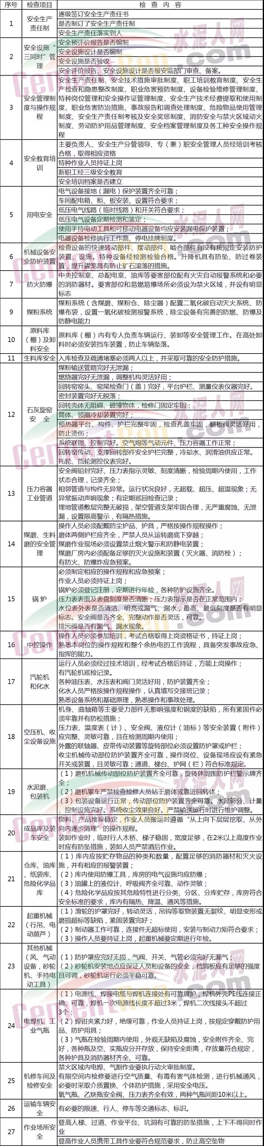 此次安全事故发生之后,或将引起新一轮全国安全大检查,危化、水泥、钢铁等领域依然是检查重点领域。下面我们一起来了解一下水泥企业安全检查查什么?