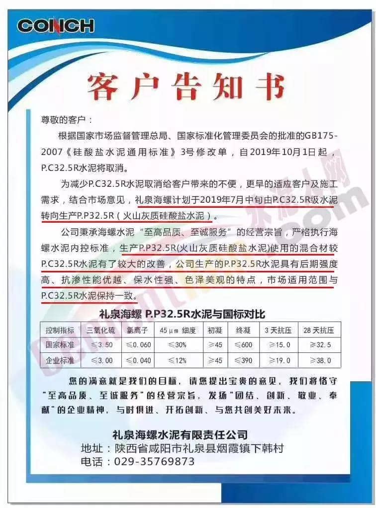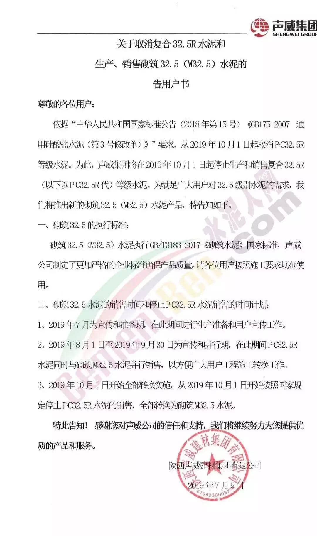 月初陕西声威建材集团有限公司首先发布《关于取消复合32.5R水泥和生产、销售砌筑32.5(M32.5)水泥的告用户书》。