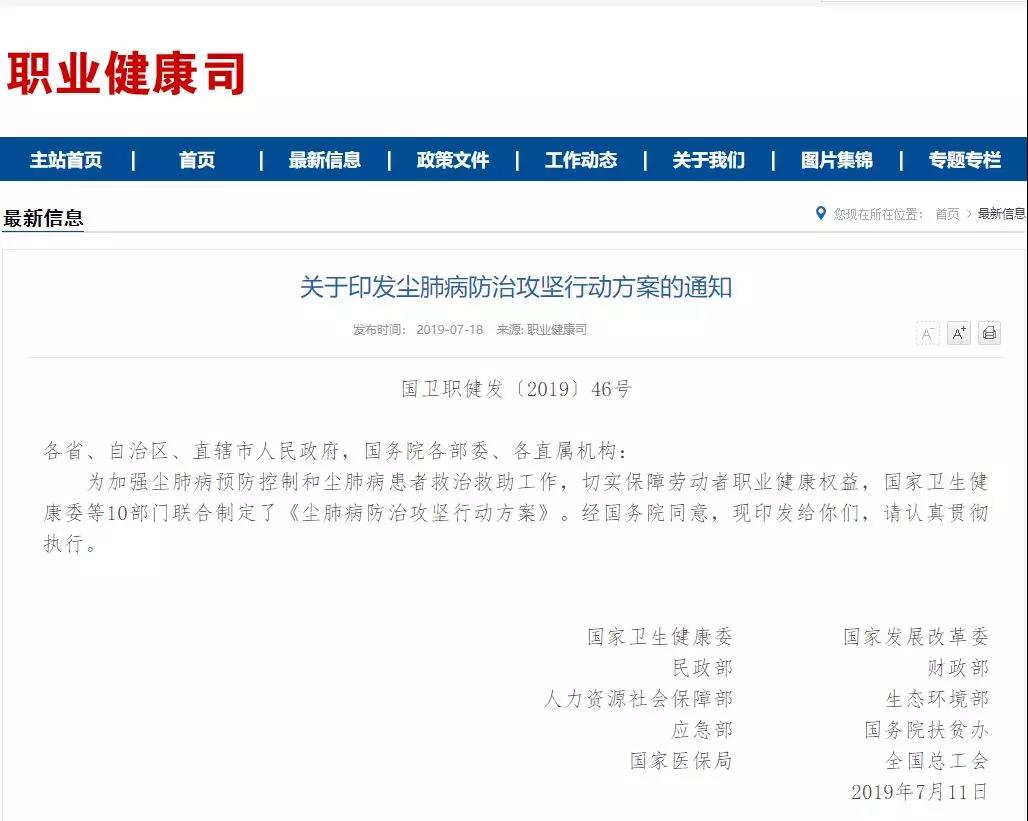 《方案》提出,建立完善国家、省、地市、县四级支撑网络。到2020年底前,试点建设或命名一批支撑机构。每个地市至少确定1家医疗卫生机构承担职业病诊断;粉尘危害企业或者接触粉尘危害劳动者较多的县区至少确定1家医疗卫生机构承担职业健康检查。在重点地区开展尘肺病康复站(点)试点,常住尘肺病患者达到100人的乡镇,依托乡镇卫生院或社区卫生服务中心建立尘肺病康复站。常住尘肺病患者达到10人的村居,依托村卫生室建立尘肺病康复点。《尘肺病防治攻坚行动方案》全文如下: