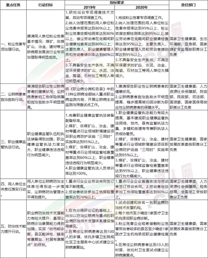 为贯彻落实党中央、国务院领导同志重要批示精神和《国家职业病防治规划(2016-2020年)》有关要求,解决当前尘肺病防治工作中存在的重点和难点问题,坚决遏制尘肺病高发势头,保障劳动者职业健康权益,特制定本行动方案。
