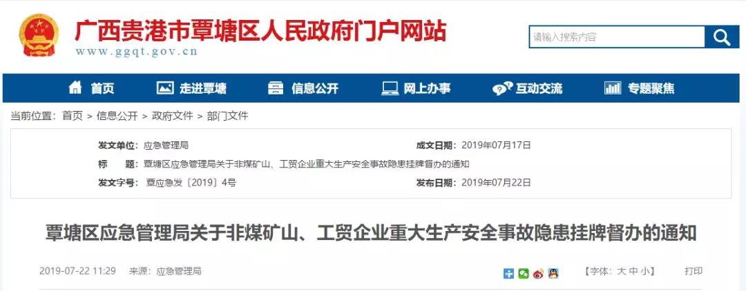 《通知》称:根据《贵港市安全生产委员会办公室关于印发2019年全市重点行业领域安全生产专项整治方案的通知》(贵安委办〔2019〕10号)和广西壮族自治区应急管理厅《关于进一步强化非煤矿山安全监管工作的通知》(桂应急发 〔2019〕16号)文件要求,广西贵港市覃塘区应急管理局聘请广西工业建筑设计研究院有限公司对覃塘区辖区华润水泥(贵港)有限公司天堂岭水泥配料用砂岩矿等8家企业进行安全生产隐患排查,发现8家企业共存在53项重大生产安全事故隐患,并下达了整改通知书,责令限期整改。