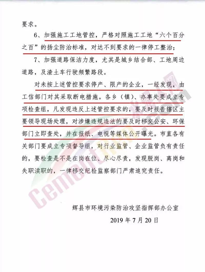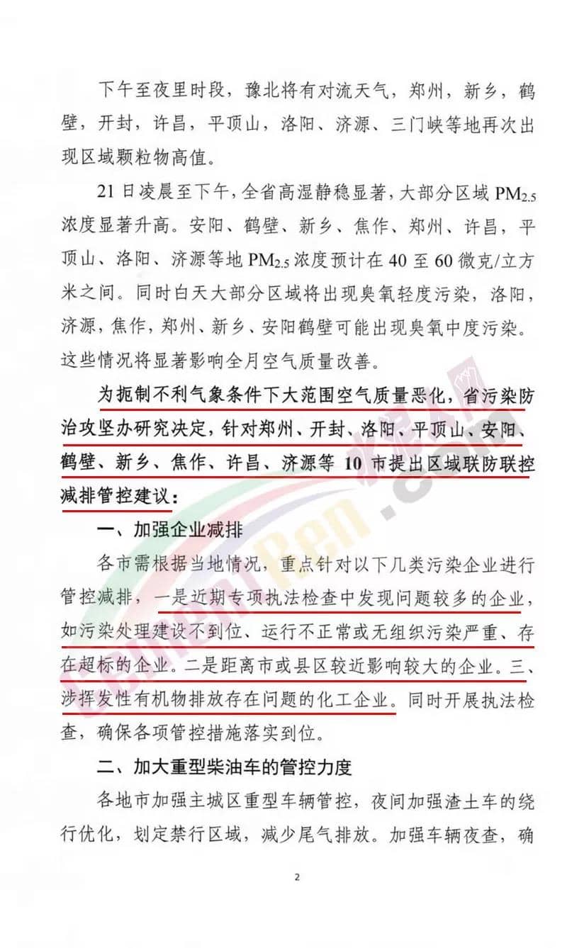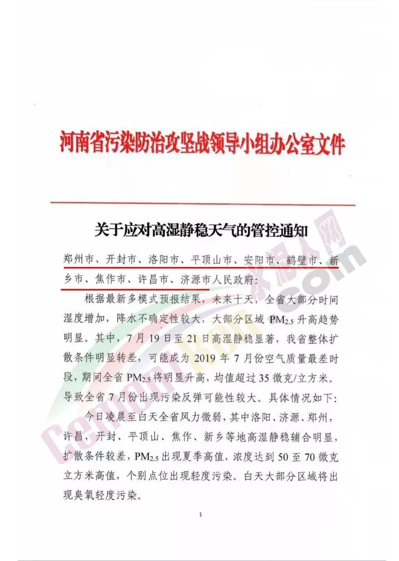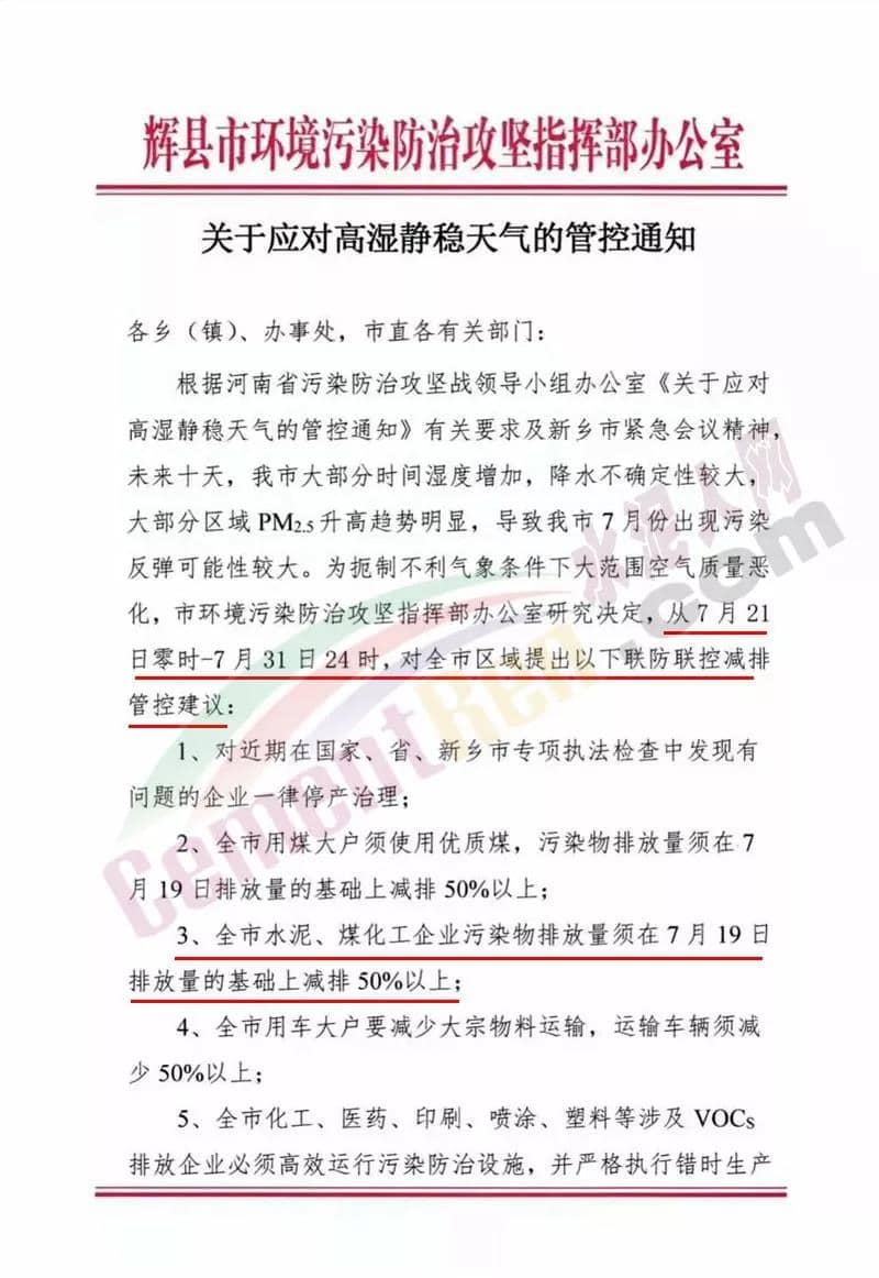 同日,辉县市环境污染防治攻坚指挥部发布《关于应对高湿静稳天气的管理通知》称,根据河南省污染防治攻坚领导小组办公室文件要求及新乡市紧急会议精神,为扼制不利气象条件下大范围空气质量恶化,辉县市环境污染防治攻坚指挥部办公室决定从7月21日零时至7月31日24时,对全市区域提出联防联控减排管控建议,全市水泥、煤化工企业污染物排放量须在7月19日排放量的基础上减排50%以上。