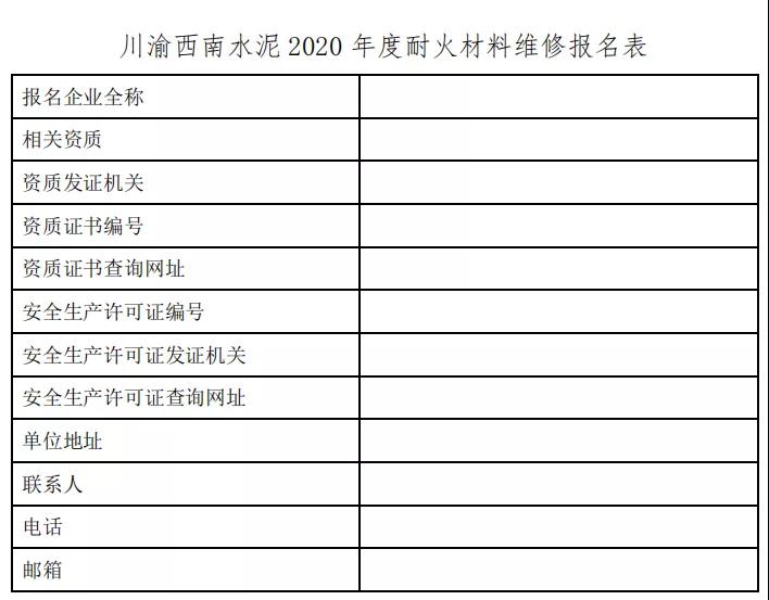 川渝西南水泥有限公司(筹)是西南水泥有限公司的旗下子公司,公司目前在运行的新型干法窑有 39 条。现面向社会统一对回转窑系统耐火材料 2020 年度维修施工工程进行招标。