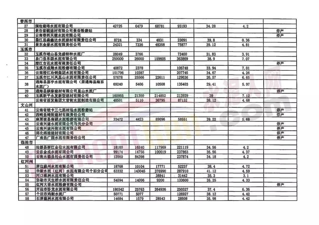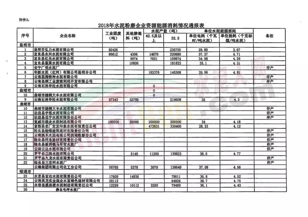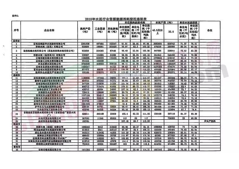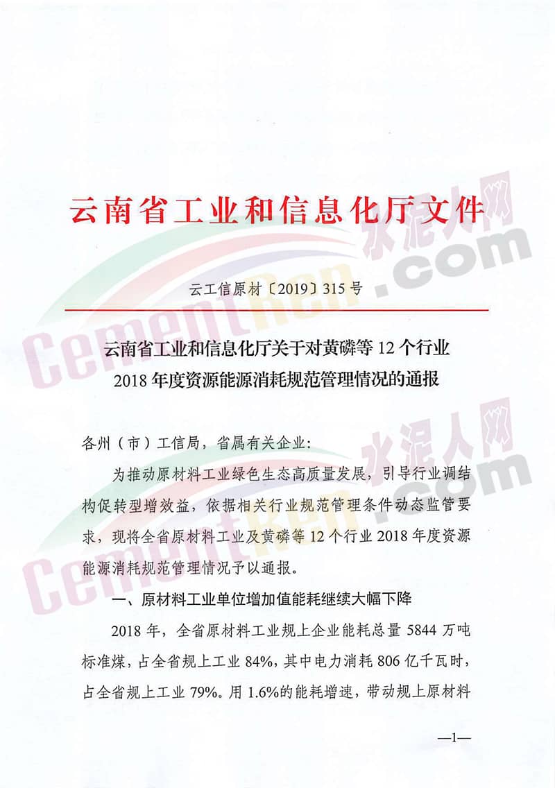 水泥人网消息:近日,云南省工业和信息化厅颁布《云南省工业和信息化厅关于对黄磷等12个行业2018年度资源能源消耗规范管理情况的通报》称:为推动原材料工业绿色生态高质量发展,引导行业调结构促转型增效益,依据相关行业规范管理条件动态监管要求,现将云南省原材料工业及水泥等12个行业2018年资源能源消耗规范管理情况予以通报。
