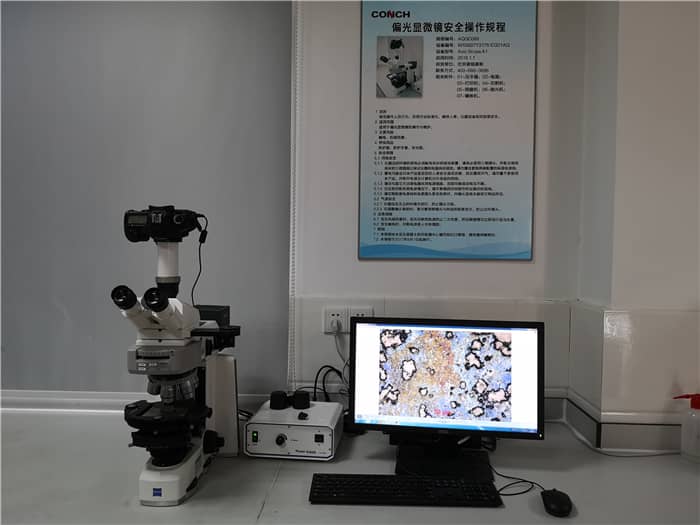 海螺集团技术中心水泥及混凝土研究监测中心,一台偏光显微镜正在工作