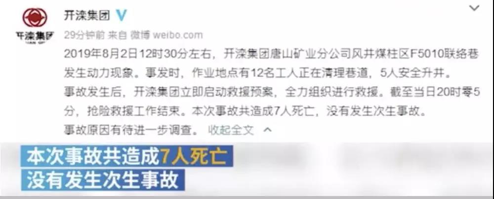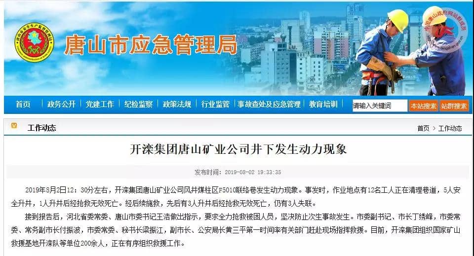 昨日(8月2日)唐山市应急管理局发布消息称:2019年8月2日12:30分左右,开滦集团唐山矿业公司风井煤柱区F5010联络巷发生动力现象。事发时,作业地点有12名工人正在清理巷道,5人安全升井,1人升井后经抢救无效死亡。经后续施救,先后有3人升井后经抢救无效死亡,仍有3人失联。
