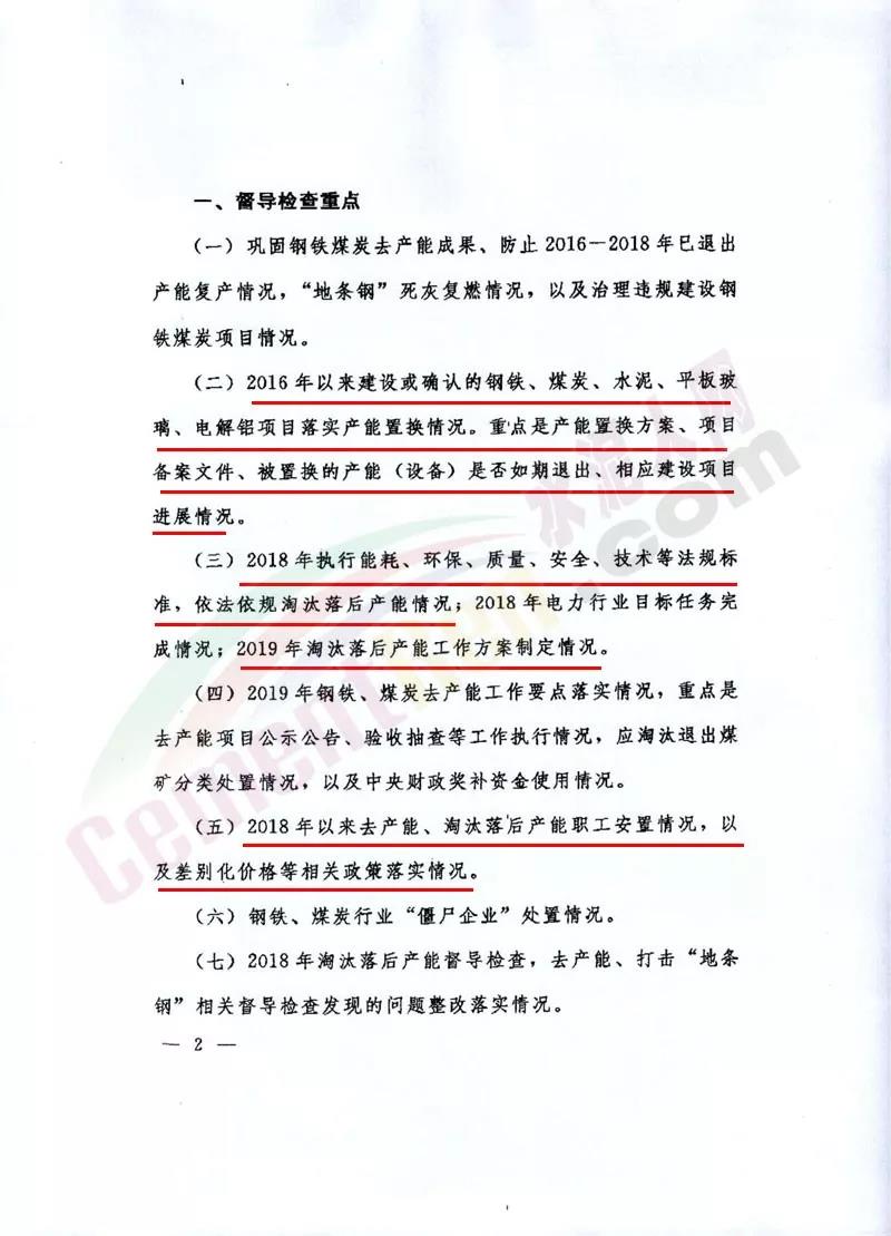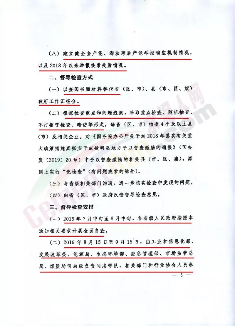 通知督导检查重点包括2016年以来建设或确认的钢铁、煤炭、水泥、平板玻璃、电解铝项目落实产能置换情况。重点是产能置换方案、项目备案文件、被置换的产能(设备)是否如期退出、相应建设项目进展情况。 2018年执行能耗、环保、质量、安全、技术等法规标准,依法依规淘汰落后产能情况;2019年淘汰落后产能工作方案制定情况。 2018年以来去产能、淘汰落后产能职工安置情况,以及差别化价格等相关政策落实情况。建立健全去产能、淘汰落后产能举报响应机制情况,以及2018年以来举报线索处置情况 。 督查检查方式包括以查阅书面材料代替政府工作汇报会;根据检查重点和问题线索,采取重点检查、随机抽查不打招呼检查、暗访等形式。对《国务院办公室关于对2018年落实有关重大政策措施真抓实干成效明显地方予以督查激励的通报》中予以督查激励的相关县(市、区、旗),原则上实行“免检查”。 督查检查安排7月中旬至8月中旬各省级人民政府按照本通知相关要求开展自查。8月15日至9月15日,由工业和信息化部、发展改革委、能源局、生态环境部、应急管理部、市场监督总局、煤监局司局级负责同志带队,相关部门和行业协会人员参加,组成10个联合督导检查组,开展实地督查检查。具体时间由各督导检查组对接确定。