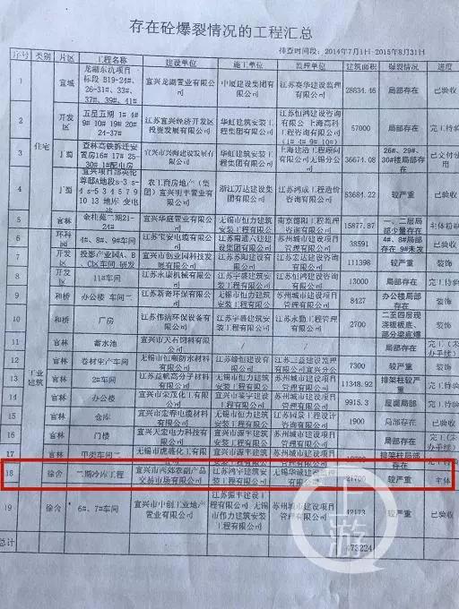 19个项目中,西郊农副产品交易市场属较为严重情形。受访者供图,三木建材签约时疑无生产资质此外,记者梳理发现,19个项目中还涉及5处住宅项目,其中一处为拆迁安置房。目前除西郊农副产品交易市场外,大部分项目已通过修复、退房等方式解决了遗留问题。另外,记者注意到,宜兴市三木建材有限公司与江苏鸿宇建筑安装工程有限公司合同签订时间为2014年9月23日,但在宜兴市住建局建设工程质量监督站提供的由无锡市建设局发放的《建筑业企业资质证书》上却标注,宜兴市三木建材有的公司取得生产资质的时间为2014年10月24日。对此,宜兴市住建局建设工程质量监督站相关负责人程冰表示,在此之前宜兴市三木建材有限公司是有预生产资格的。一般对混凝土检测只是根据国家规定进行强度测试,多次检测过程中均显示合格,且目前国家并无混凝土中不允许掺杂钢渣的规定。“当时该企业给我们上报成分时并未标注有钢渣成分,而且据我们调查,企业不是在所有批次中均添加钢渣。且由于钢渣中存在游离成分,放置时间长的也就挥发掉了,没有挥发的游离成分被添加在混泥土中,遇水则发生了氧化反应。其氧化和爆裂的时间也是无法确定的。”程冰解释。而对于为何在混凝土中添加钢渣,此前,宜兴三木建材有限公司负责人缪幸福在接受媒体采访时称,28天的石块反应期内并没有出现过爆裂现象。在混凝土中添加废钢渣是不少混凝土企业的常用手法,且其发现将废钢渣添加到混凝土中后会增加其硬度,因此才将废钢渣当做粗骨料与石子一起添加到混凝土中使用。而对于出现问题后如何处理,缪幸福称还在等待权威部门的鉴定结果,而这一等就是4年时间。