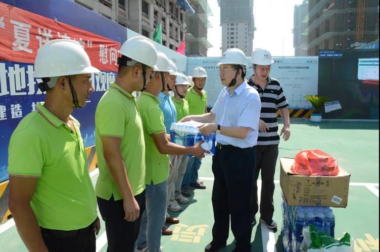 国贸集团党委书记、董事长范阳向现场施工人员赠送了仁丹、绿豆等防暑降温用品。