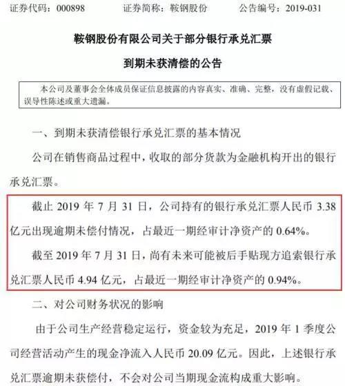 8月1日,鞍钢股份披露了一则公告。公告显示,截止2019年7月31日,公司持有的银行承兑汇票人民币3.38亿元,出现逾期未偿付情况,占最近一期经审计净资产的0.64%;截至2019年7月31日,尚有未来可能被后手贴现方追索银行承兑汇票人民币4.94亿元,占最近一期经审计净资产的0.94%。