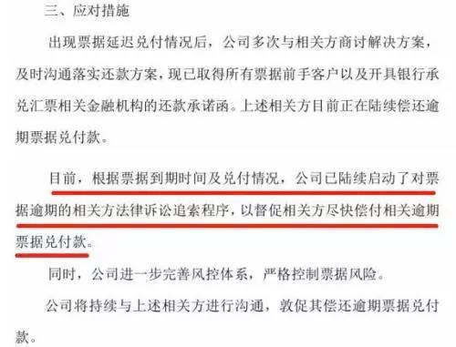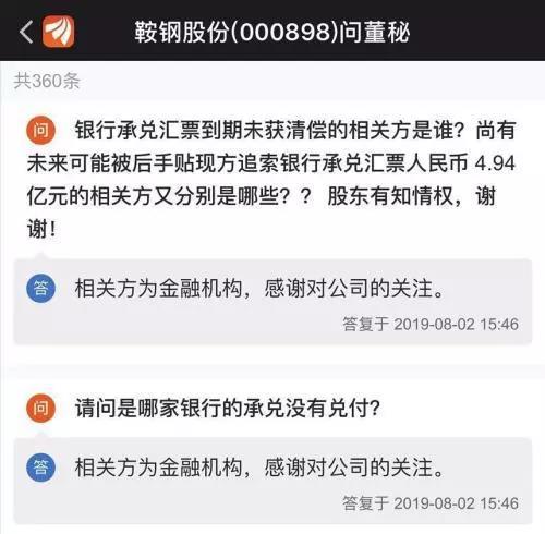 鞍钢股份表示,由于公司生产经营稳定运行,资金较为充足,2019年1季度公司经营活动产生的现金净流入人民币20.09亿元。因此,上述银行承兑汇票逾期未获偿付,不会对公司当期现金流构成重大影响。公司亦给出了应对措施。公司表示,出现票据延迟兑付情况后,公司多次与相关方商讨解决方案,及时沟通落实还款方案,现已取得所有票据前手客户以及开具银行承兑汇票相关金融机构的还款承诺函。上述相关方目前正在陆续偿还逾期票据兑付款。目前,根据票据到期时间及兑付情况,公司已陆续启动了对票据逾期的相关方法律诉讼追索程序,以督促相关方尽快偿付相关逾期票据兑付款。同时,公司进一步完善风控体系,严格控制票据风险。公司将持续与上述相关方进行沟通,敦促其偿还逾期票据兑付款。在这份公告中,鞍钢股份并未指出是哪家金融机构违约,但此事还是引起了投资者的强烈关注。有投资者在投资者互动平台就此事询问鞍钢股份董秘,但未获明确回复。