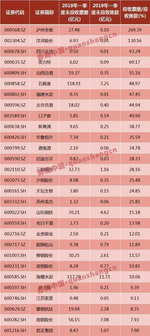 而从应收票据占应收账款的比例来看,A股市场有206家应收票据超过应收账款的上市公司,其中白酒类上市公司持有的应收票据比例普遍较高,泸州老窖应收项中几乎全是应收票据。其次是钢铁板块。