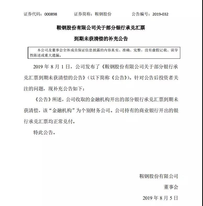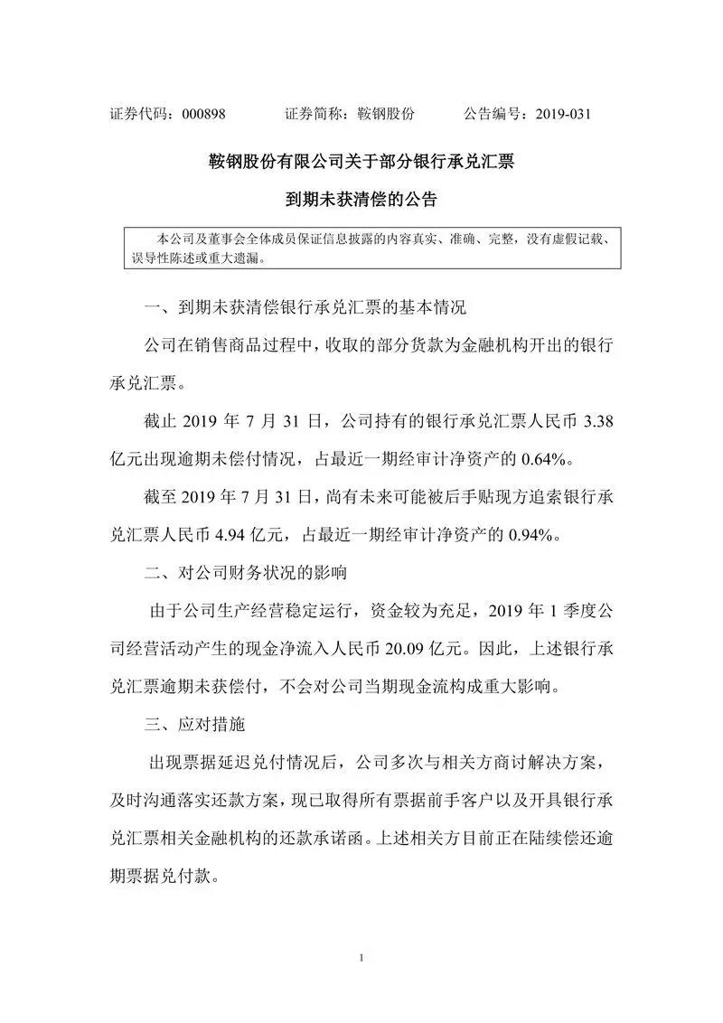 据水泥人网了解,鞍钢股份日前发布的一则“部分银行承兑汇票到期未获清偿”的公告迅速引发市场关注。截至7月31日,尚有未来可能被后手贴现方追索银行承兑汇票4.94亿元,两者银行承兑票据合计8.32亿元。