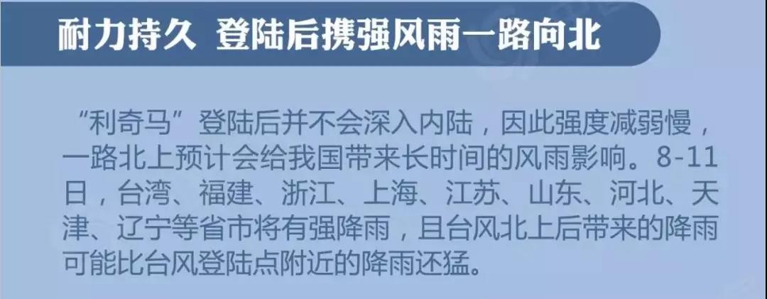 持续时间长——台风“利奇马”未来登陆中国后,也并不会深入内陆,强度减弱慢,比较有利于维持台风环流,一路北上预计会给中国带来长时间风雨影响。