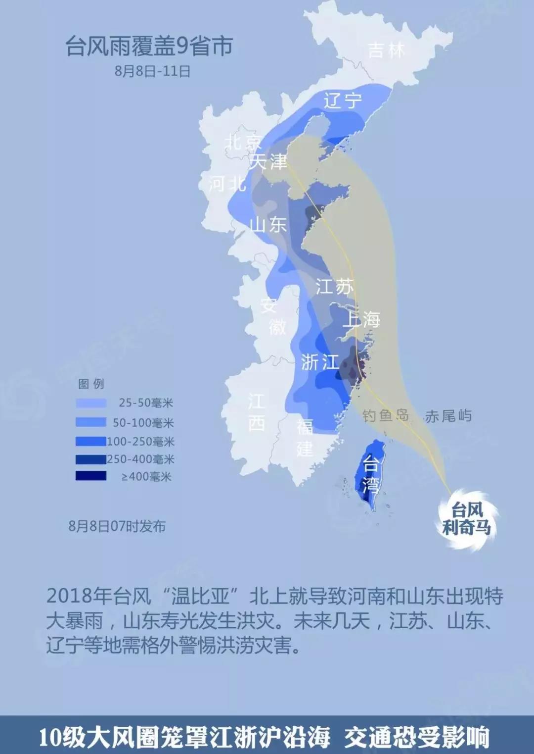 影响范围广——台湾、福建、浙江、上海、江苏、山东、天津、辽宁等8省市将受到台风直接影响。后期,台风和冷空气结合还会给华北东部、东北等地带来大范围强降雨。