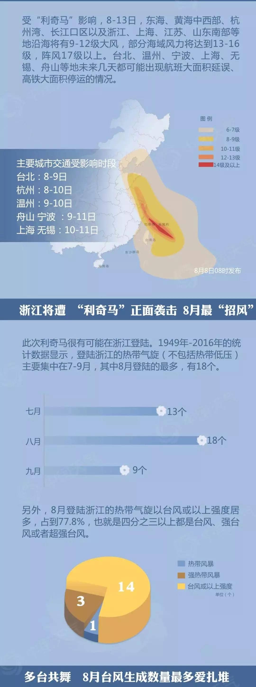 风雨强度大——8日至13日,东海、黄海中西部、杭州湾、长江口区以及浙江、上海、江苏、山东南部等地沿海将有9至12级大风,部分海域风力将达到13至16级,阵风17级以上。8日至11日,台湾岛、浙江中东部、上海、江苏东部、山东东部、辽东半岛等地将有大暴雨,台湾岛中部、浙江东部等地局地特大暴雨,浙江东部累计降雨量300至500毫米,台湾岛中部达500至700毫米。