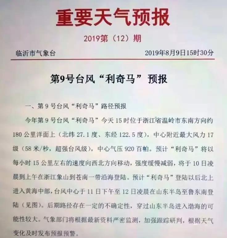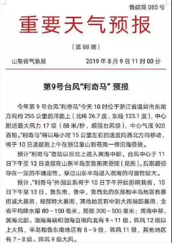 山东省气象局发布第9号台风“利奇马”预报称,预计台风中心于11日下午至12日凌晨在山东半岛至鲁东南登陆。后期路径存在一定的不确定性,穿过山东半岛进入渤海的可能性较大。预计“利奇马”外围 云“系于10日下午开始影响山东省。