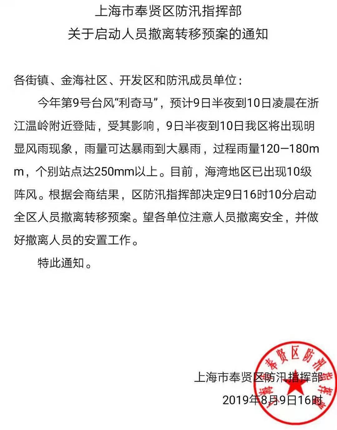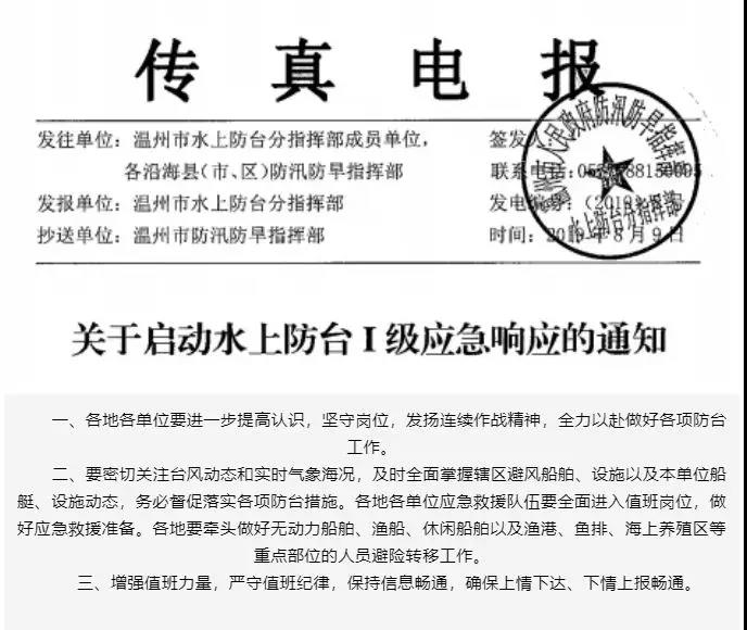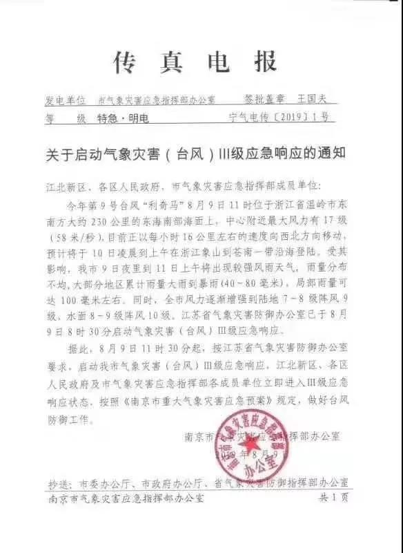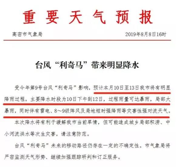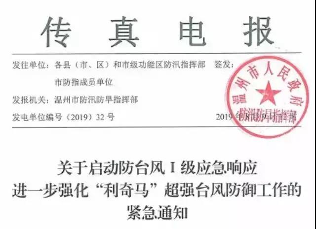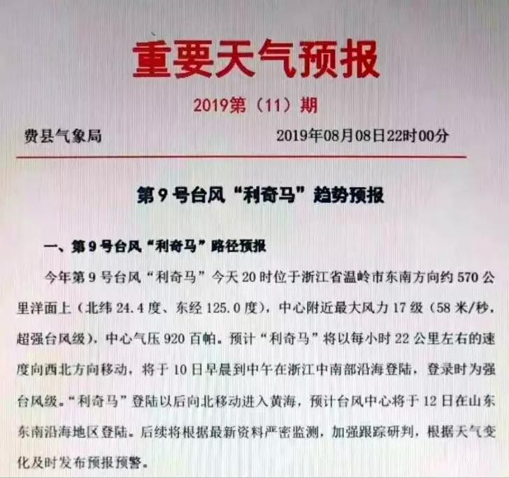 8月9日宣城市气象局发布重大气象信息专报称,第9号台风“利奇马”(超强台风)今天早晨8时位于距离浙江省温岭市东南方向约290公里海面上,中心附近最大风力17级(58米/秒),中心最低气压920百帕。9日下午至11日受“利奇马”外围 云系影响,宣城市有一次强降雨和大风天气过程。需防范强降雨可能引发的城乡积涝和山洪地质灾害,防御强风给安全生产、交通、旅游、电力等带来的不利影响,需注意高空及水面作用安全。