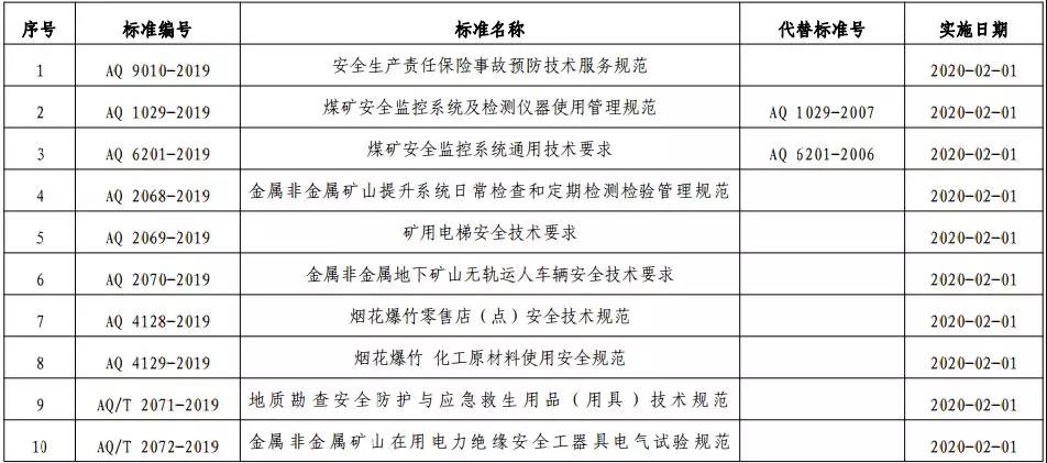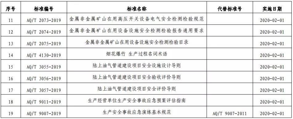 水泥人网消息:日前,应急管理部发布2019年第15号公告称,已批准了包括安全生产责任保险事故预防技术服务规范(AQ 9010-2019 )、 金属非金属矿山提升系统日常检查和定期检测检验管理规范(AQ 2068-2019)、 金属非金属地下矿山无轨运人车辆安全技术要求(AQ 2070-2019)、金属非金属矿山在用电力绝缘安全工器具电气试验规范(AQ/T 2072-2019 )、金属非金属矿山在用高压开关设备电气安全检测检验规范(AQ/T 2073-2019 )、金属非金属矿山在用设备设施安全检测检验报告通用要求(AQ/T 2074-2019 )、 金属非金属矿山在用设备设施安全检测检验目录(AQ/T 2075-2019)、生产经营单位生产安全事故应急预案评估指南(AQ/T 9011-2019 )、 生产安全事故应急演练基本规范(AQ/T 9007-2019)等标准在内的19项安全生产行业标准,并将自明年年2月1日起施行。