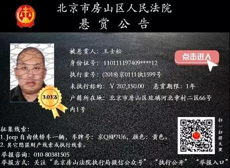凡向法院举报被执行人王士松的财产或执行线索,最终完成强制执行并执行到位的,将由法院按举报的财产或执行线索执行到位金额的15%予以奖励。此次关于王士松的悬赏期限为1年,最高悬赏额为3.03万元。