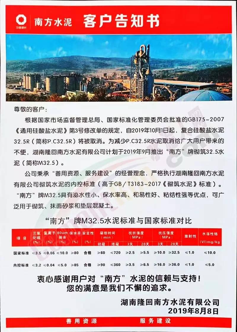 南方水泥秉承“善用资源、服务建设”的经营理念,严格执行湖南隆回南方水泥有限公司砌筑水泥的内控标准(高于GB/T3183-2017《砌筑水泥》标准)。“南方”牌M32.5具有泌水性小,保水率高、和易性好、粘接性强等优点,可广泛用于砌筑,抹面砂浆和垫层混凝土。南方水泥客户告知书原文如下: