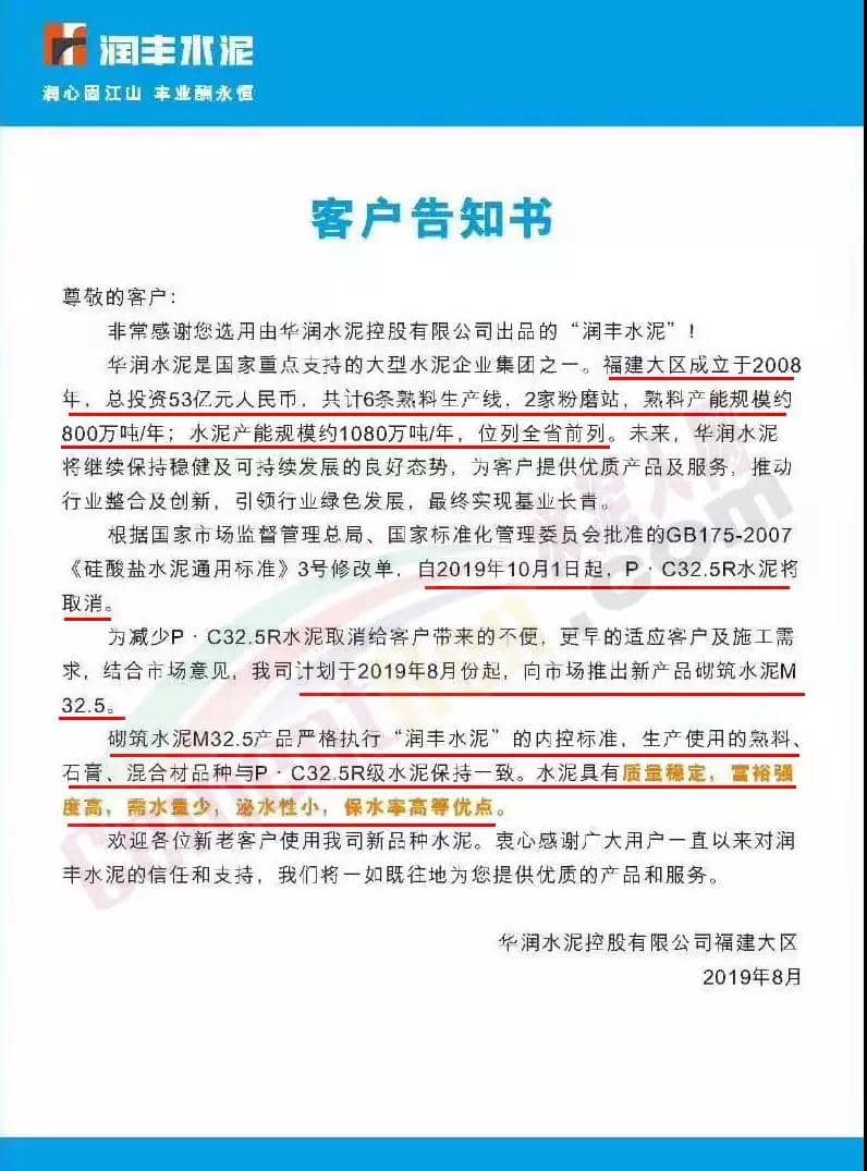 同期,华润水泥控股有限公司福建大区亦发布了《客户告知书》称,福建大区成立 于2008年,总投资53亿元人民币,共计6条熟料生产线,2家粉磨站,熟料产能规模约800万吨/年,位列全省前列。根据国家市场监督管理总局、国家标准化管理委员会批准的GB175-2007《硅酸盐水泥通用标准》3号修改单,自2019年10月1日起,P.C32.5R水泥将取消。为减少P.C32.5R水泥取消给客户带来的不便,更早的适应客户及施工需求,结合市场意见,公司计划于2019年8月份起,向市场推出新产品砌筑水泥M32.5。砌筑水泥M32.5产品严格执行“润丰水泥”的内控标准,生产使用的熟料、石膏、混合材品种用P.C32.5R级水泥保持一致。水泥具有质量稳定、富裕强度高,需水量少,泌水性小,保水率高等优点。