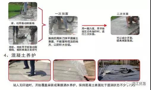 2)碎石:含泥量≤1.0%,泥块含量≤0.2%;针片状颗粒含量≤10%;宜使用2cm-3cm连续级配石子; 3)水:使用饮用水 、自来水;不得使用海水、生活污水及含有糖分、油渍、酸碱度高的水;4)水泥:水泥在运输过程与储存时不得受潮和混入杂物等;水泥要根据不同生产厂家、品种、强度等级、批次分别存放,不得混杂;水泥进出库要做到先进先出,后进后出;水泥存放时间过长,应重新取样检验,确定符合标准后方可使用;对于南方多雨季节,建议尽快用完,避免存放时间过长;根据工程特点、设计、施工要求及所处的环境,选用适当品种和强度等级的水泥,同一施工部位应采用同一厂家、同一品种、同一强度等级的水泥2、施工过程混凝土表面接近初凝时(判断方法:按一般力度,用手指按压,有手印且略有粘手),用钢抹刀进行二次压平、压光;接近终凝时(判断方法:按一般力度,用手指按压,略有手印但不粘手),进行第三次抹压。终凝前发现表面有干缩裂缝,应立即采取抹压措施予以消除,然后立即用湿麻袋或薄膜覆盖养护。注意洒水养护,保持混凝土表面一直处于湿润状态,如此养护不少于7天时间。以上措施可有效预防裂缝的产生。