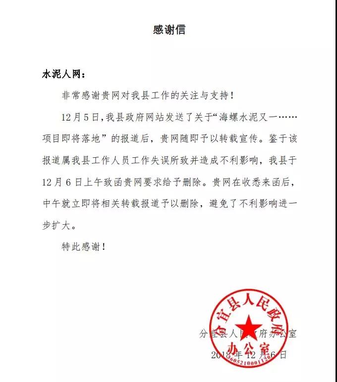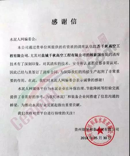 正如贵州锦屏和泰水泥有限公司感谢信里讲的,作为水泥行业的服务平台,水泥人网为水泥企业在环保治理、节能降耗等经验交流方面提供了非常好的参考,为水泥企业和设备企业之间搭建了信息沟通的桥梁,为推动水泥行业发展做出了重要的贡献。